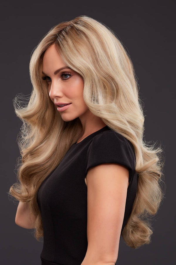 Jon Renau Kim echt haar Gemaakt met het fijnste Remy mensenhaar en extra lange lagen die bijna tot aan de taille vallen, heeft Kim een rekbare handgeknoopte kap en een niet-detecteerbaar lace front. Deze pruik van echt haar heeft ook een lichte dichtheid om de meest natuurlijke look en beweging te creëren